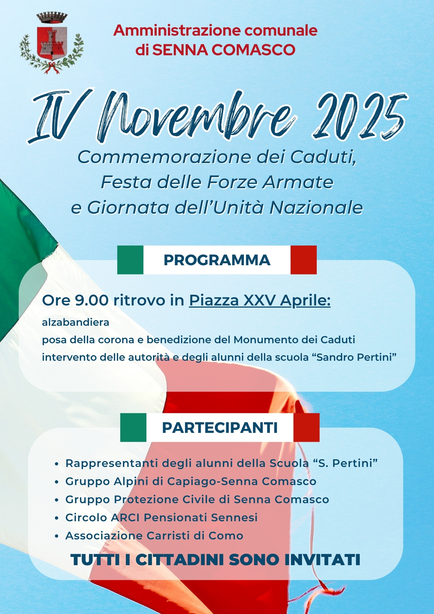 La cerimonia di commemorazione si svolgerà martedì 4 novembre 2025 alle ore 9.00 in Piazza XXV Aprile a Senna Comasco.